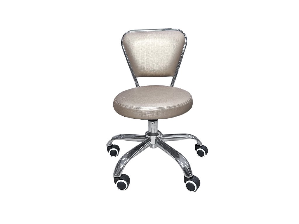 Nízká ergonomická pracovní židle v elegantní béžové barvě s lesklým povrchem je ideální volbou pro pedikérky, kosmetičky a další profesionály v beauty oboru.